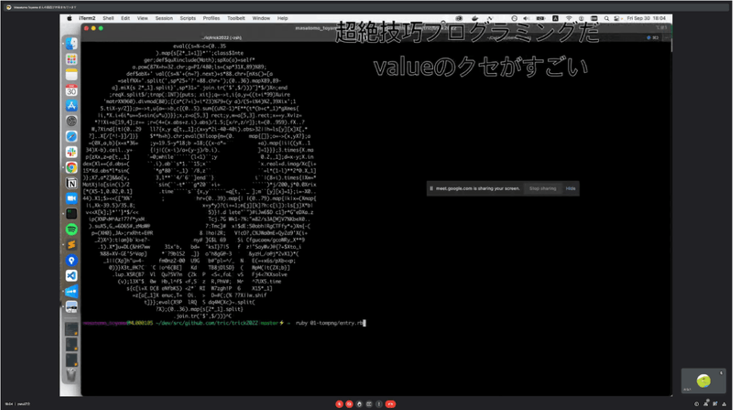 他にも難読化されたRuby コードを競い合うプログラミングコンテストtrick(https://github.com/tric/trick2022) の入賞作品を手元で実行した時は、「超絶技巧プログラミングだ」という声が上がっていました。