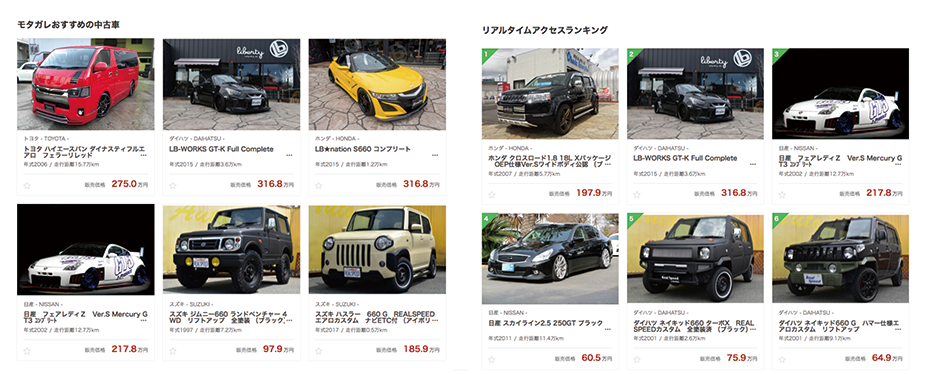 当社「モタガレ」と契約している日本全国のカーパーツメーカーさんやショップさんの、「カスタムすることにより付加価値が増加しているクルマ」を専門的に、魅力的に販売するサービスです。