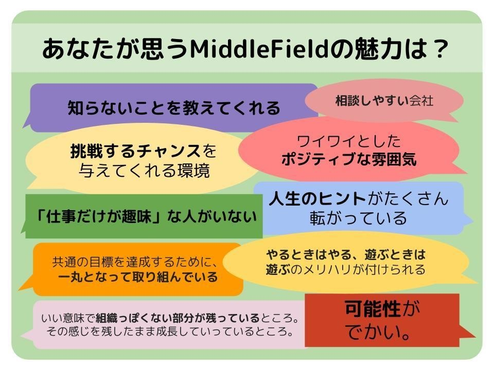 おまけとして、社内報の企画で行った「MiddleFieldの魅力は?」というアンケートの結果をご紹介します。圧倒的に多かったのが、「挑戦できる環境」という回答。その他にも、マーケットの大きさや社内の雰囲気に関する回答が多かったです。