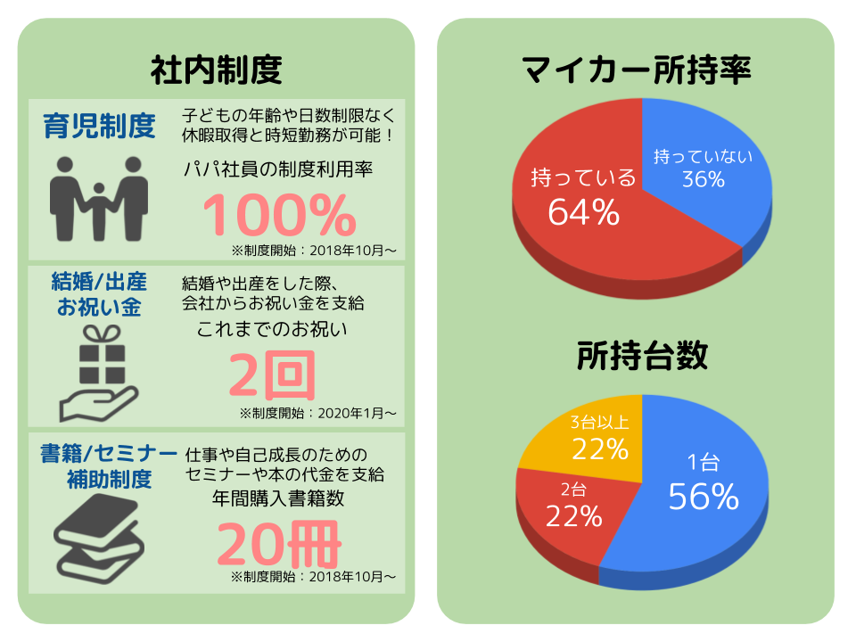 社員のマイカー所持率は64%。2019年の東京都の自動車保有率は51.7%(※東京都 生活文化局「ゼロエミッション東京の実現に向けた自動車利用に関する世論調査」より)なので、平均を上回っていますね。