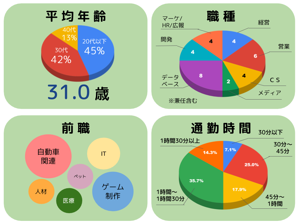 現在MiddleFieldの社員は、アルバイトを含めて30人。年齢は20代~30代が約90%を占めます。仕事では自動車に関わった経験のないメンバーも多く働いています。職種としては、学生アルバイトメンバーが活躍するデータベースチームが最も多い人数比率になっています。