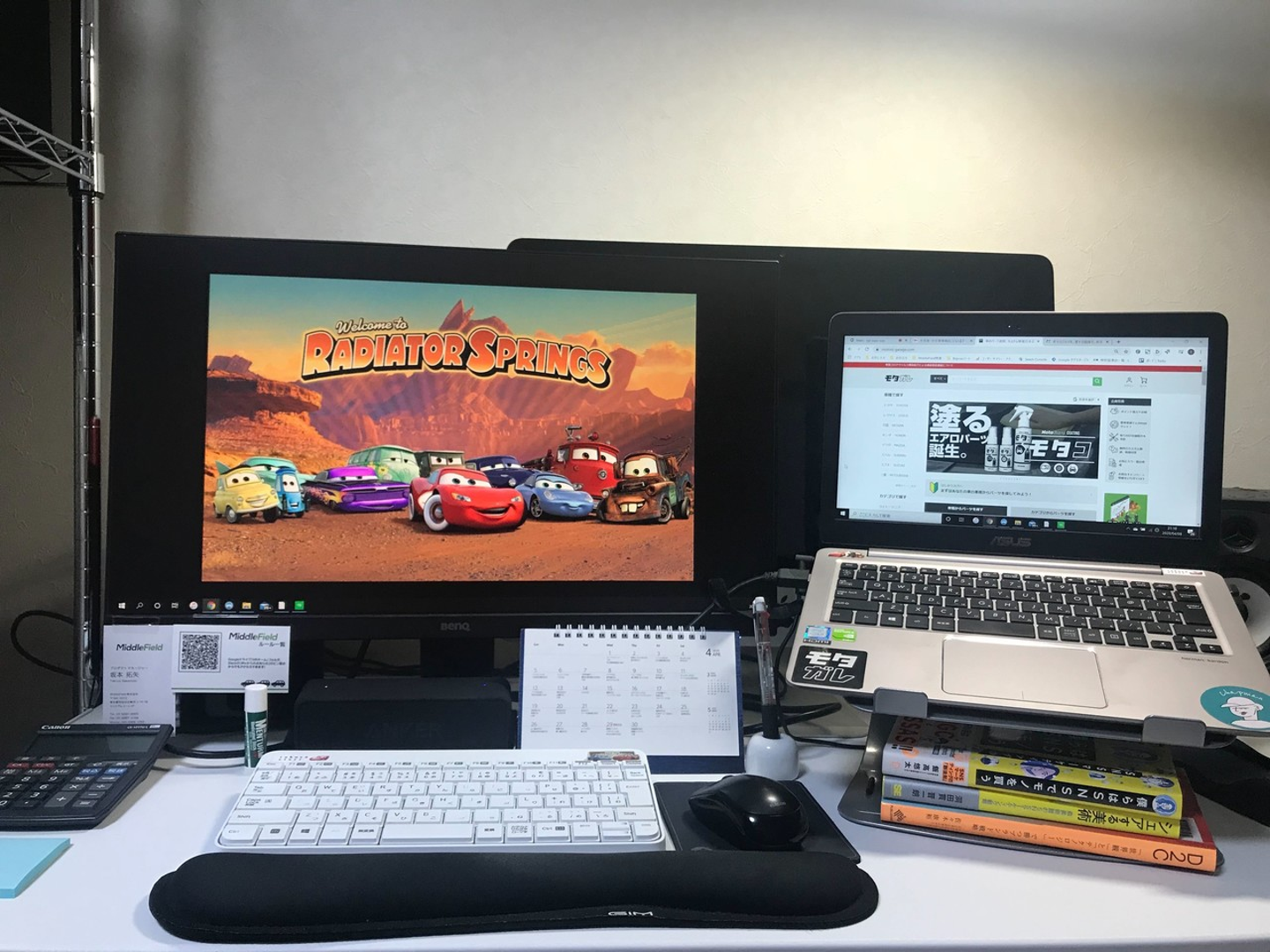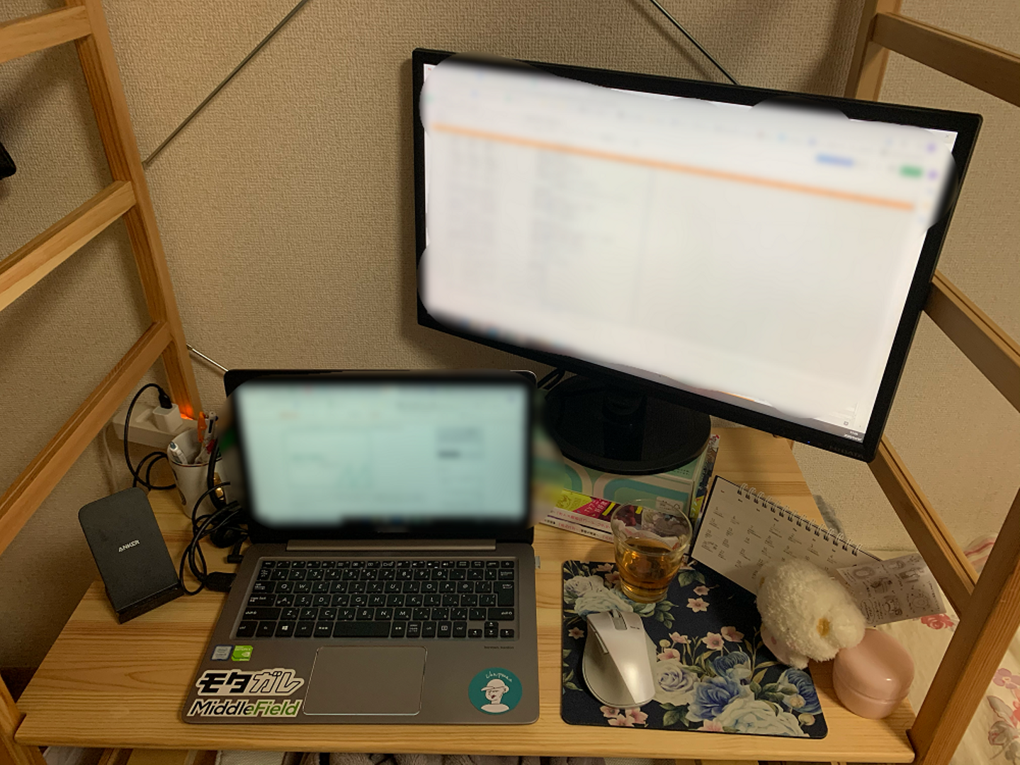 モニターやPCスタンドからカレンダーまでありとあらゆるものを自宅に持ち帰り、ほぼオフィスと同じ環境を再現しています。