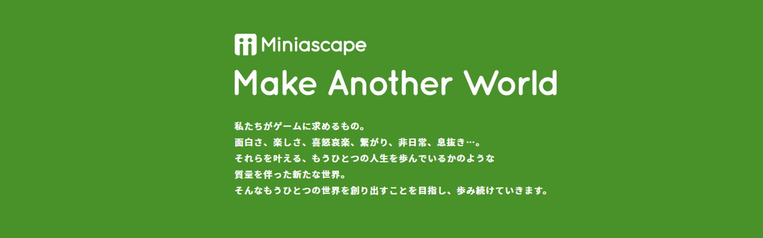 2017年10月に設立されたHappyElementsグループの東京の新たな開発拠点となります。 「プレイヤーひとりひとりがそこに住み、生きているかのような世界を創り出していきたい。」 そんな想いや初心を込め、箱庭という意味合いの「Miniascape(ミニアスケイプ)」を社名としました。 自分達自身が面白い、楽しい、と心の底から思えるものを作りきることを第一に、 「剥き出しの面白さ」を追いかけていきます。