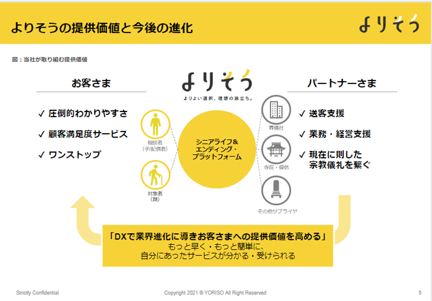 よりそうでは、こうした社会課題に対して真正面から向き合い、「DXで業界進化を導き、お客様への提供価値を高める」、「もっと早く・もっと簡単に、自分に合ったサービスがわかる・受けられる」という価値を届けていきたいと考えています。
