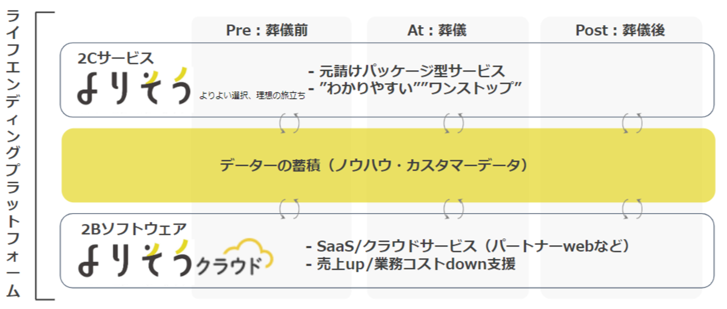 当社には「よりそうお葬式」をはじめとするDCS事業(ダイレクトコンシューマーサービス事業)と、葬儀社様の売上/生産性向上のDX支援を行うクラウド事業(SaaS事業)の2つがあります。