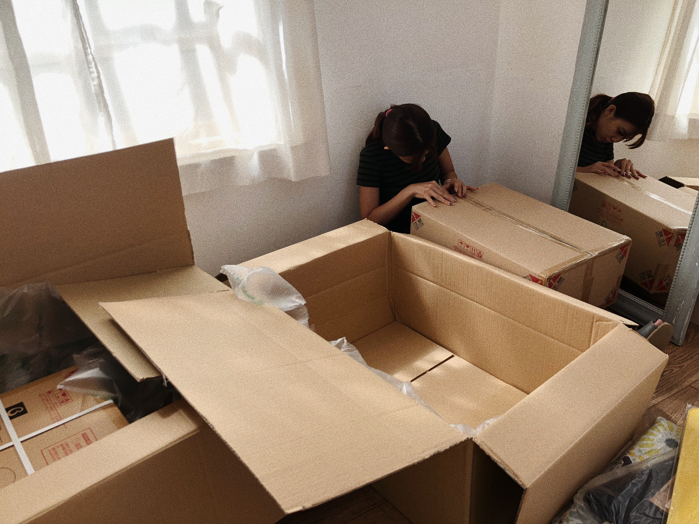 AM8時:スタジオに着いたら商材の検品、丁寧に商品を広げていきます。