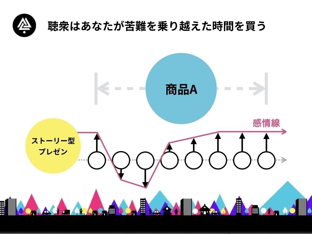 実は、自分も昔はみなさんと同じ状態だったんですよー。ということを失敗談としてストーリーで表現します。すると、プレゼンターと聴衆の心理的距離は徐々に近づいていきます。