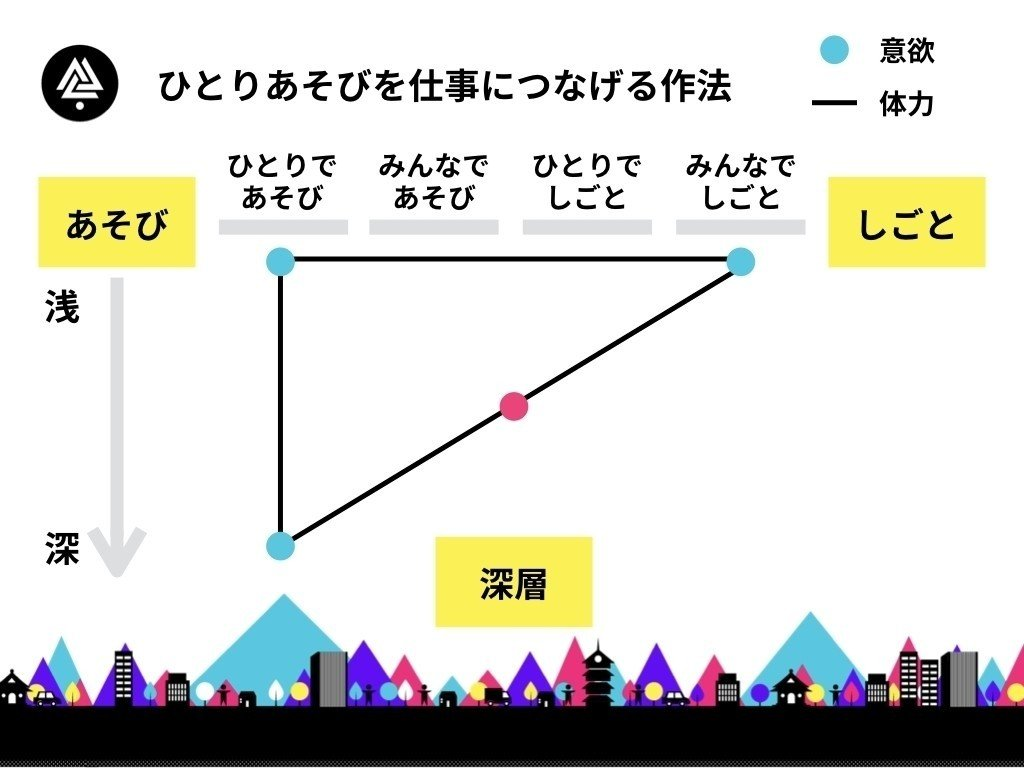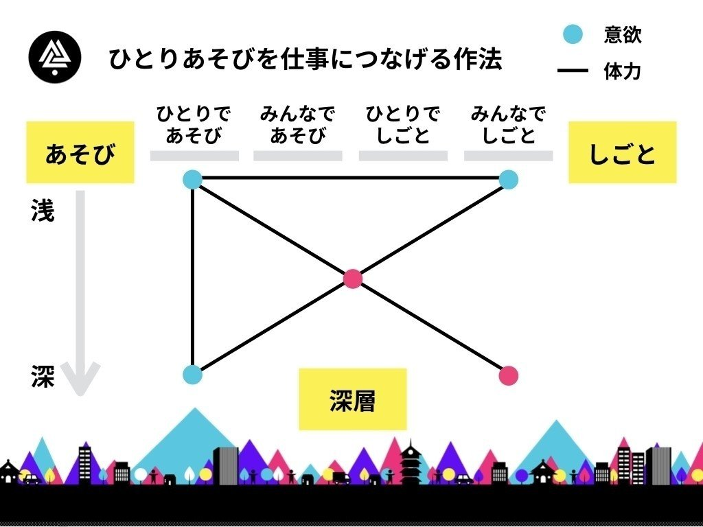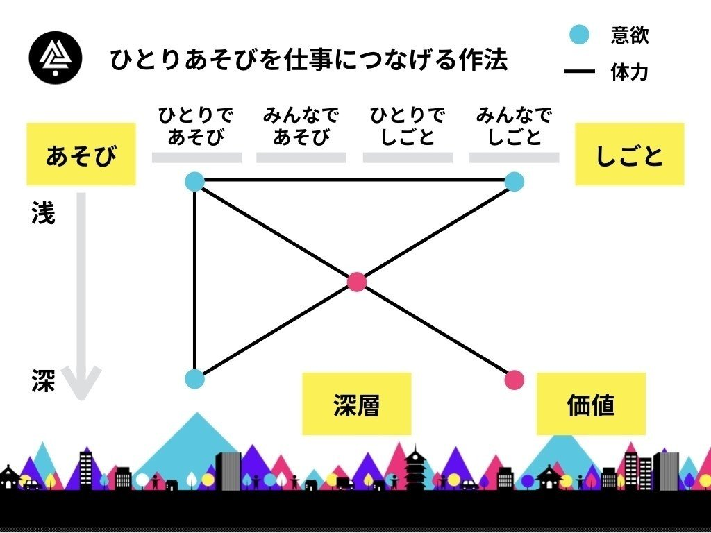 「あそび」と「しごと」がつながる中点が見つかったら、「みんなでしごと(深)」をめがけてズバッと線を引きます。