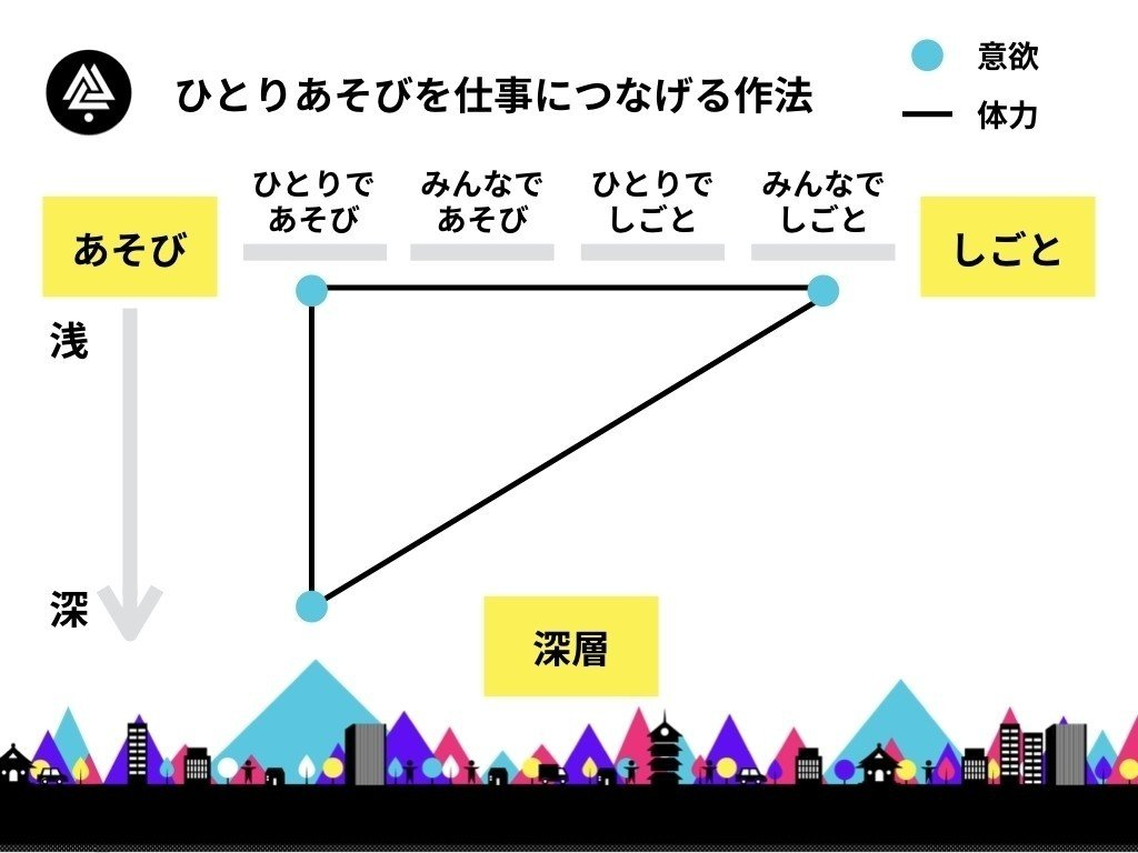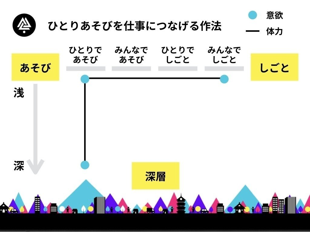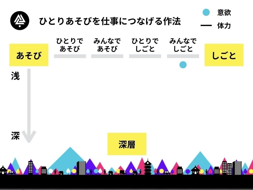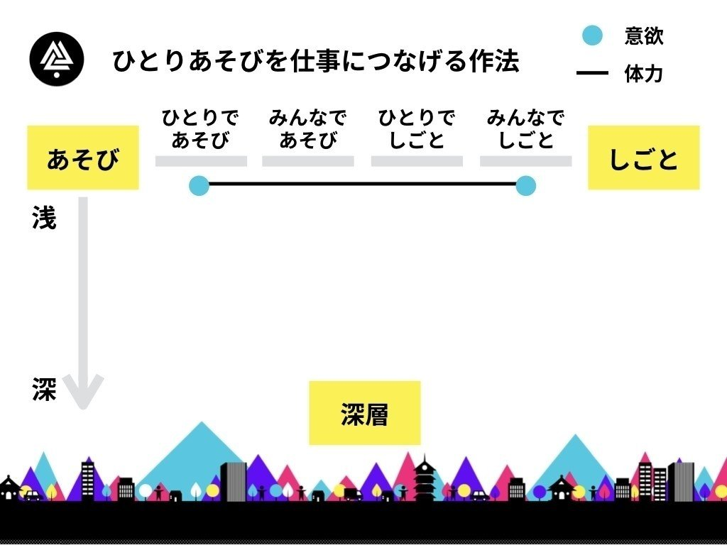 あなたが異常行動にをとればとるほど、最終的に「あそび」と「しごと」がつながったときの総面積は広くなります。面積の広いストーリーを組めたときのインパクトは凄まじくデカイです。