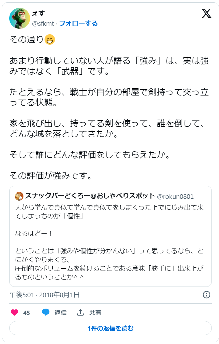 母数が多いことをやっていても埋もれるだけですし、母数が少なくてもやってることを深めていないと「よう聞く話やなー、おもんね」で終わりです。