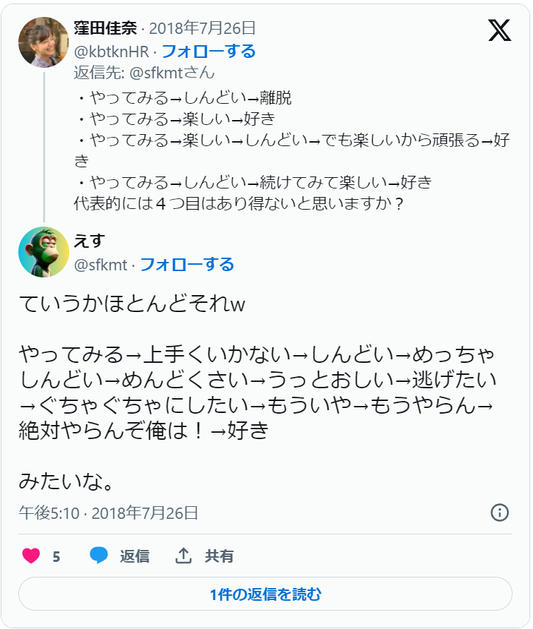 僕は、Do what you like(好きなことことをやる)ではなく、Like what you do(やってることを好きになる)から始めようと、よくツイートしています。