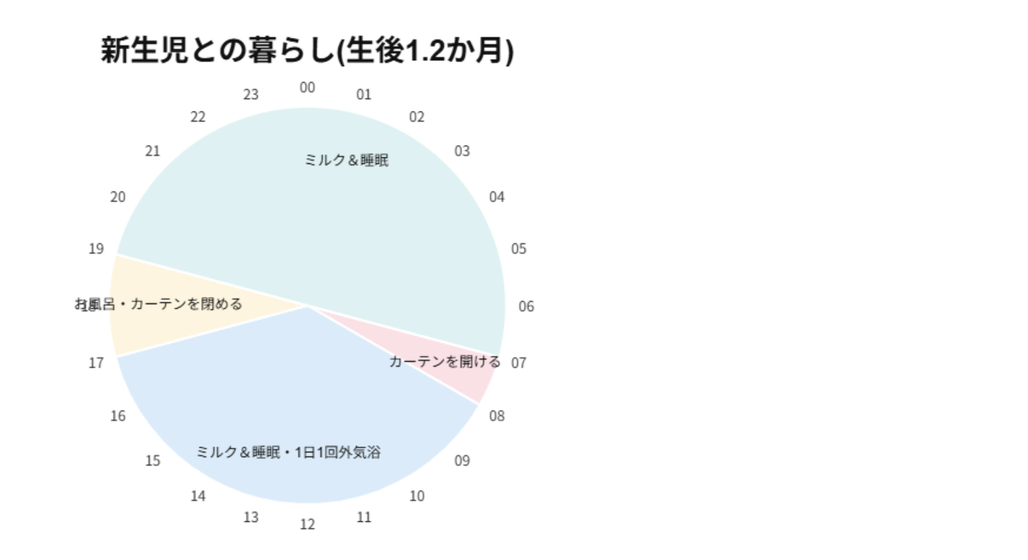 カーテンの開け閉め、お風呂の時間が大体の時間で決めただけで、後はつどつど赤ちゃんにあわせて対応していきます。