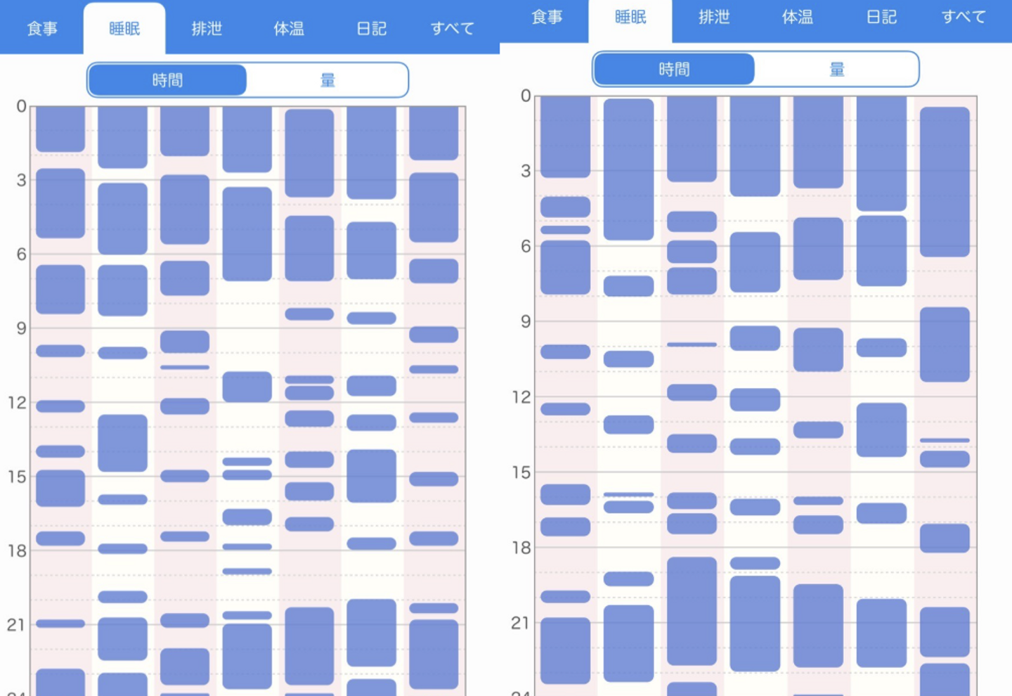 睡眠量・ミルク量などもグラフで比較ができます。育休中に比べると大分睡眠時間がまとまってきました!