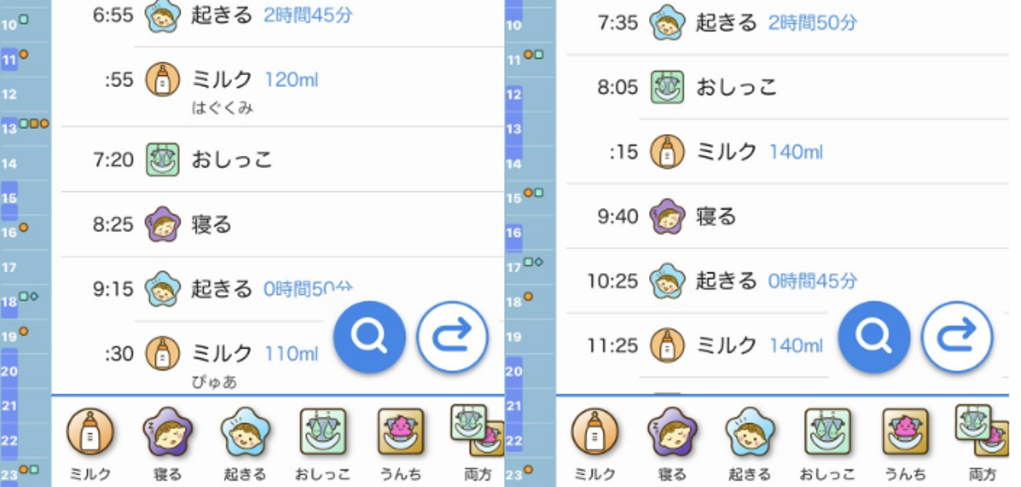 いつ寝て、いつ起きて、ミルクはどれくらい、排便は?などを下記アプリ「ぴよログ」で記録するようにしています。