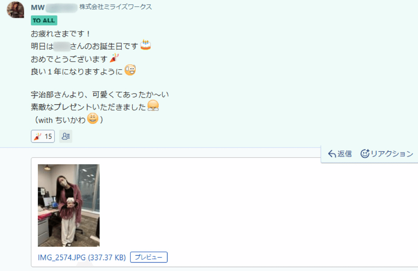 プレゼントが渡された様子がすぐにチャットにアップされます。すると東京大阪の社員がリアクション機能を使ったりして一斉にお祝いしてくれるんです💌