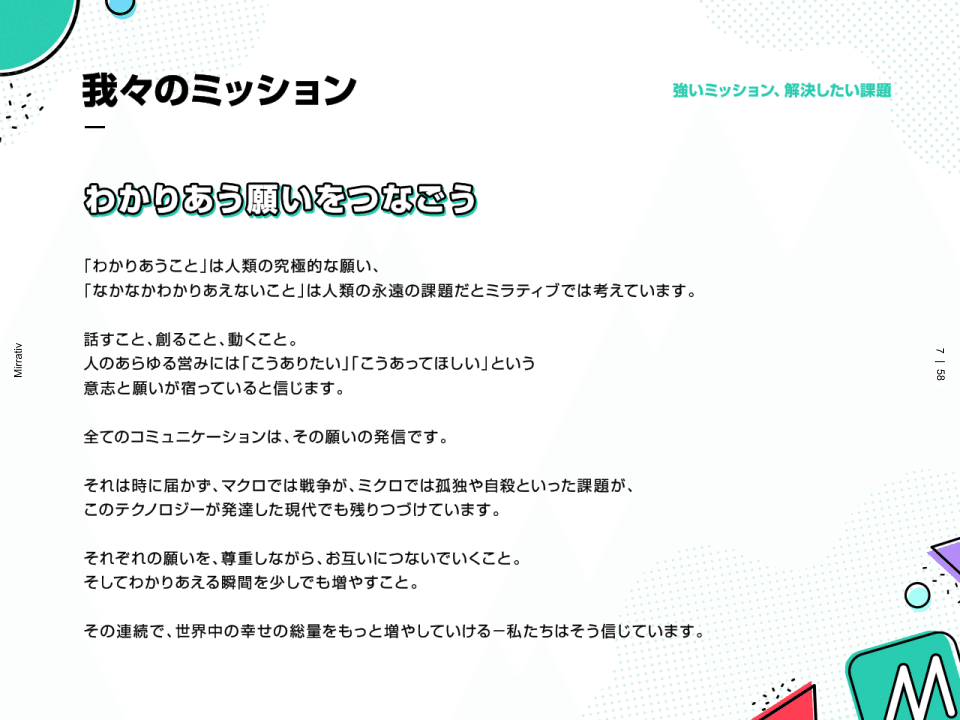 形だけじゃない「行動理念と行動指針」 これは個人的に思っていることですが、行動理念や行動指針は形骸化しやすく、文字として在るだけになってしまっていることも少なくないと思っています。そんな中、ミラティブには「わかりあおうとし続けるガイドライン」という行動理念と行動指針の具体的な実践ガイドがあります。
