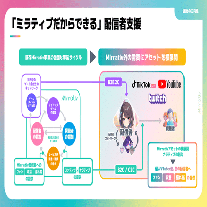 赤川:妻木さんに相談された当時、ミラティブでは「Mirrativアプリに限らず、他のプラットフォームを利用する配信者にも価値を提供できないか」という検討を始めていました。そこで「まず誰に価値を届ける事業をつくるのか」を考えたとき、サポートに対するニーズが高い個人VTuberが注力領域として挙がってきました。