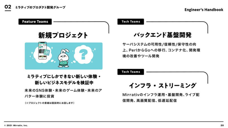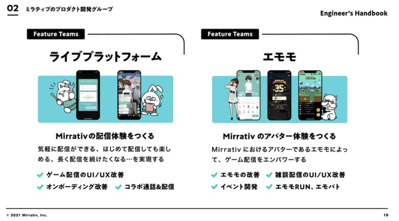 千吉良「ミラティブのエンジニアはいま、大きく3つのチームにわけられています。1つはライブプラットフォームチームといって、ライブ配信に関わるアップデートを担当しています。2つめはエモモチームで、3Dアバター機能エモモ周辺の改善やアップデートにあたります。そして、2021年から新しく増えたのが新規プロジェクトのチームです。