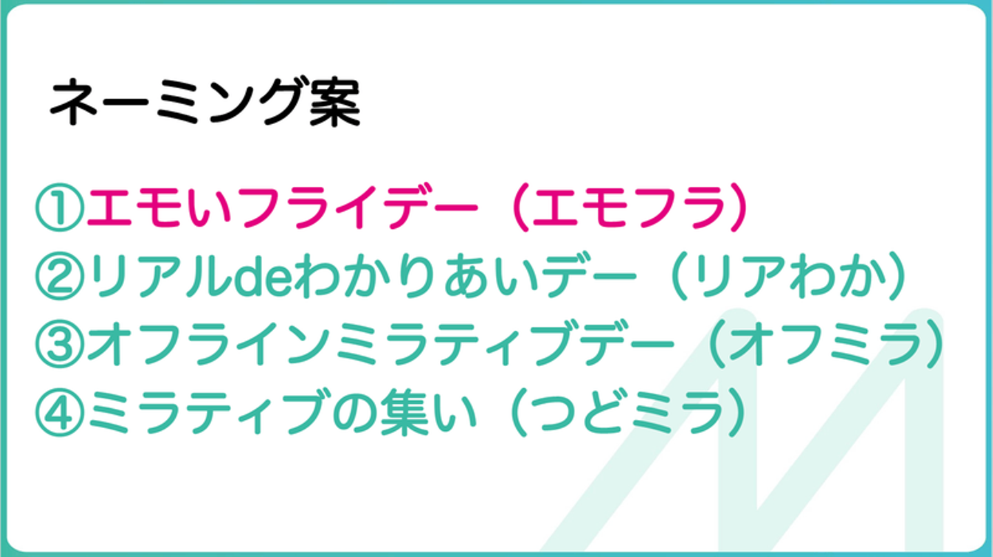 - 「出社推奨デー」だと味気ないので「エモいフライデー」としました。略して「エモフラ」です。