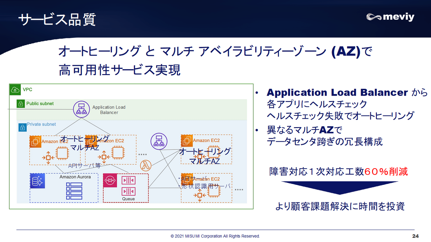 3つ目は、サービス品質、可用性についてです。基本的にインスタンスはマルチAZで配置しておりALBからアプリケーションにヘルスチェックを送り、ヘルスチェックが失敗すればオートヒーリングによりインスタンスを再構築して自動復旧させるといったところで今のアーキテクチャになる前と比較して保守工数を60%削減しています。より顧客課題解決に時間を投資したいということでこちらも現状うまく行っているかなと思っています。