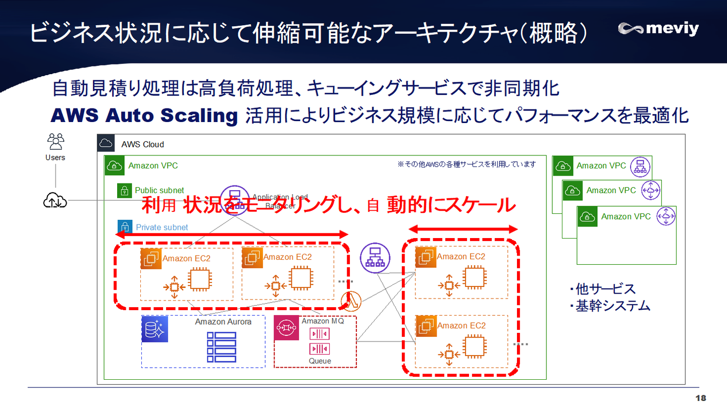 1つ目は、自動見積り処理については高負荷がかかる処理なので、非同期処理で実行している点、EC2 Auto Scalingにより負荷に応じてスケールしやすい作りになっている点についてお話しました。meviyは年々ユーザー数が伸びており、プロモーションも積極的に打つようになっていて、直近、「meviy FA 3周年の大幅リニューアル記念 3ステップキャンペーン」といったキャンペーンにも十分耐えられるような工夫をしています。