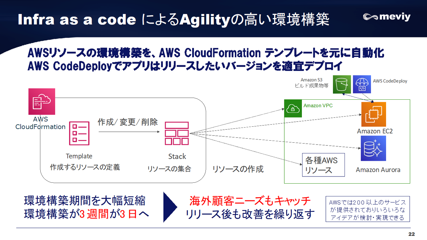 2つ目は、開発環境構築についてです。meviyを開発していると、事業チームからの要望として「まずはある機能を開発してみて実際に機能が動くデモ環境をお客様に触ってもらいたい、そしてニーズを確認したい」という話がよくあります。また、環境をすぐ作ってその役目が終われば環境を削除するというシーンが頻発します。グローバルに展開していくにあたってもグローバルの各リージョンからこういったニーズ確認に対する要望は今後も継続して上がってくることが容易に予想されます。ネットワーク的な依存関係を極力排除するような構成を工夫し、CloudFormation、CodeDeployを徹底活用、すぐに環境を準備しターゲットのアプリのバージョンをデプロイし、お客様や社内のステークホルダーと機能が確認できるようにしています。目先の開発ばかりに目を向けるのではなく、このAgilityの高い環境構築の実現にリソースと時間をしっかり投資しやりきったことで今ではmeviyの進化をしっかり支えるインフラになっていると思います。