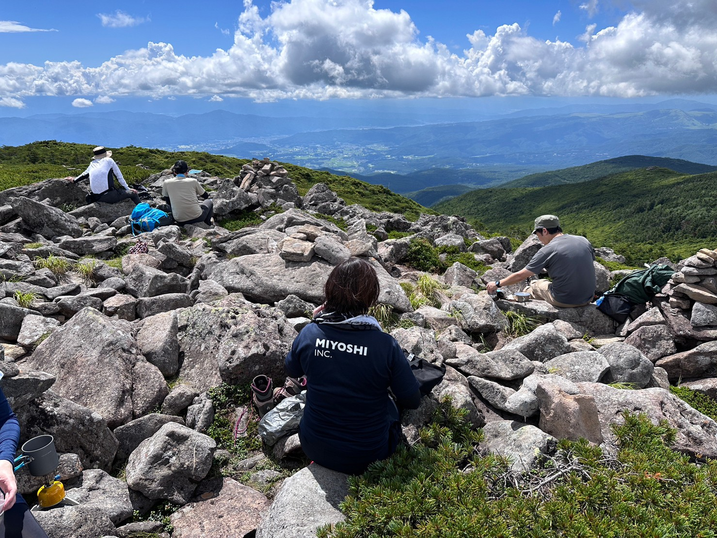 疲れてますね。でもすごいいい眺めだったらしいです。ミヨシのポロシャツを着てますね!夏のミヨシの制服はメッシュ素材のポロシャツなので確かに登山にもぴったりかも…と思ったり。頂上でカップラーメンも食べたり挽きたてのコーヒーを飲んだりしたらしいですよ。山の上で食べるカップラーメンは美味しそうですね。