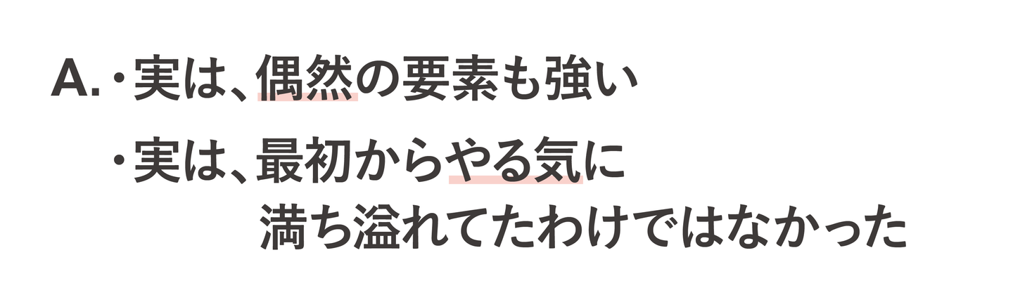 大変なこととうまいこと付き合いつつ、「しばらく続けていればいいことが起こるんじゃないか」という気持ちで過ごした日々の積み重ねが今なので、「どう頑張ったか」を聞かると難しいですね。