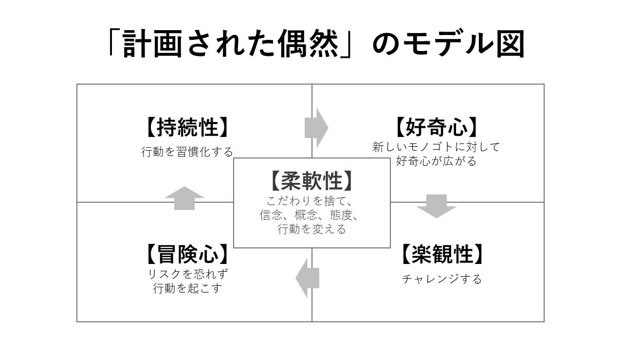 では、単に偶然に身を任せるしかないのかと言うとそうではなく、偶然自体を計画的に設計することが大切だと、計画的偶発性理論は説いています。
