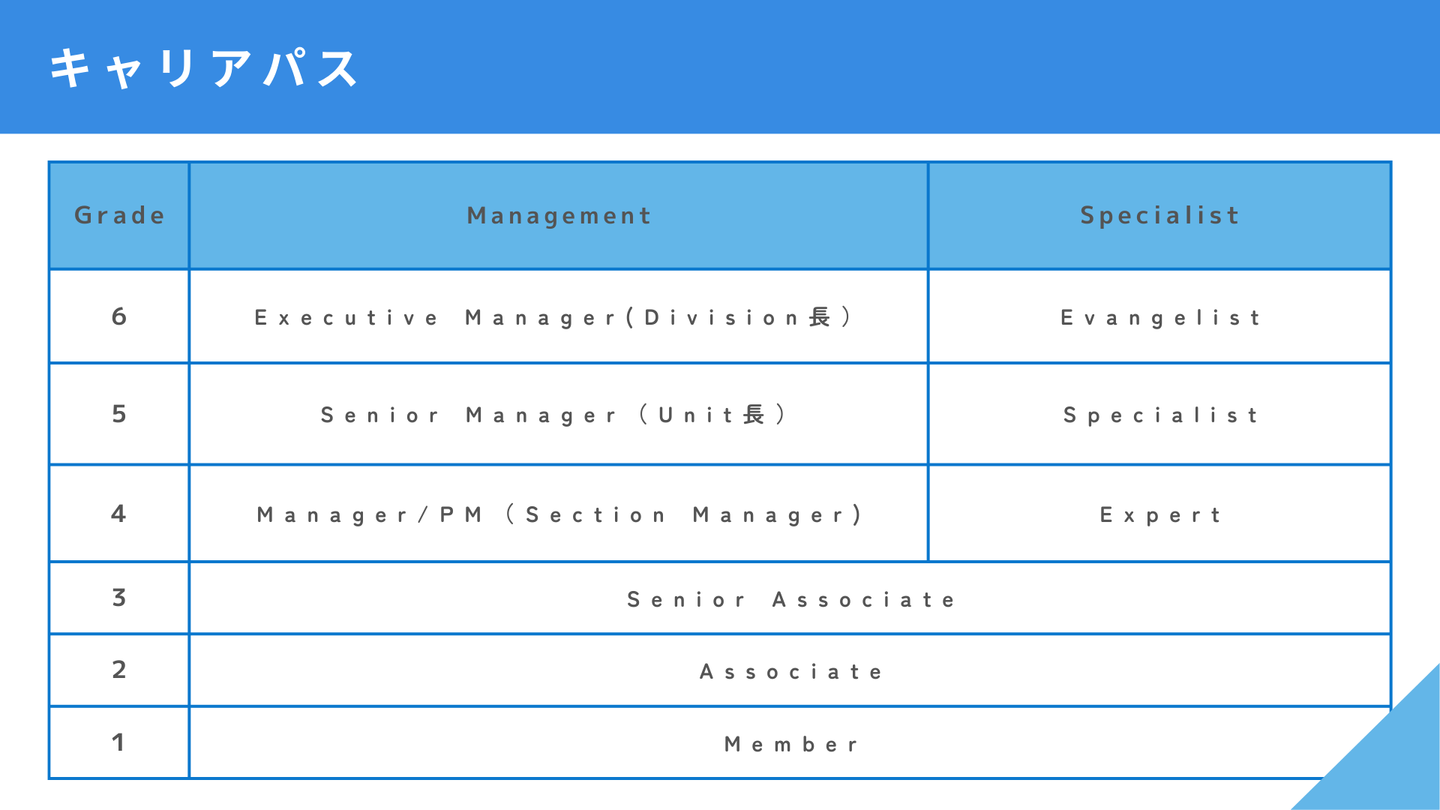 ゆえに、スペシャリストキャリアのキャリアパスが見えるように全社員に人事制度が可視化されており、自身の職務の専門スキルを伸ばすことによって、どんなポジションにおいてもスペシャリストを目指せるように設計されています。