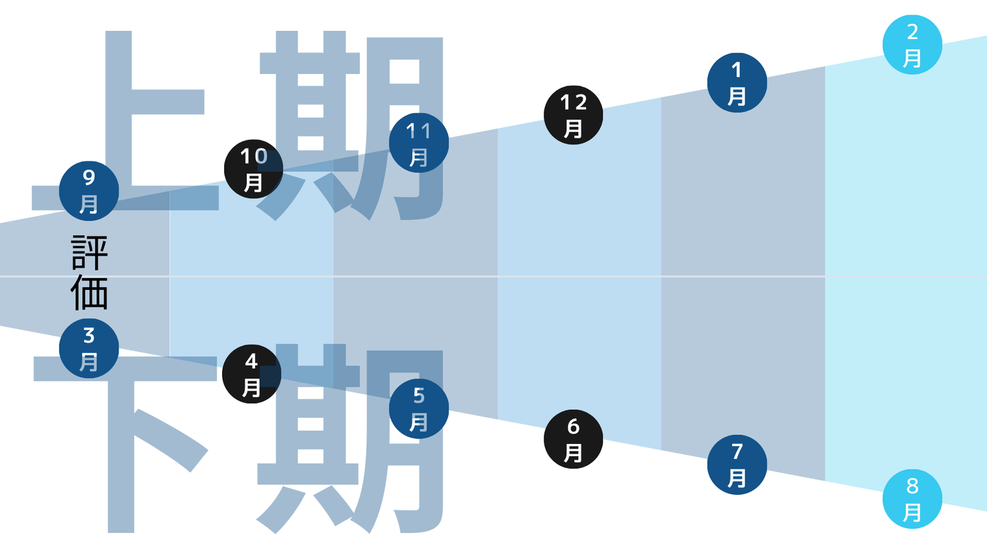 モビルスでは9月~2月を上期、3月~8月を下期としており、評価は3月・9月の年2回実施をしています。