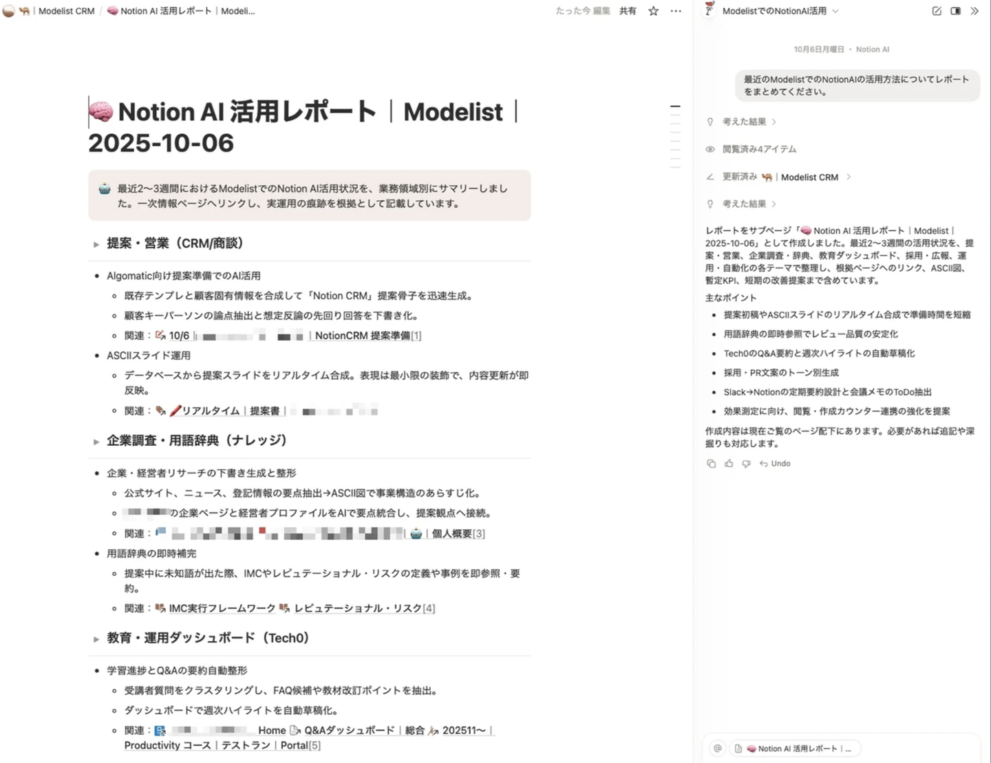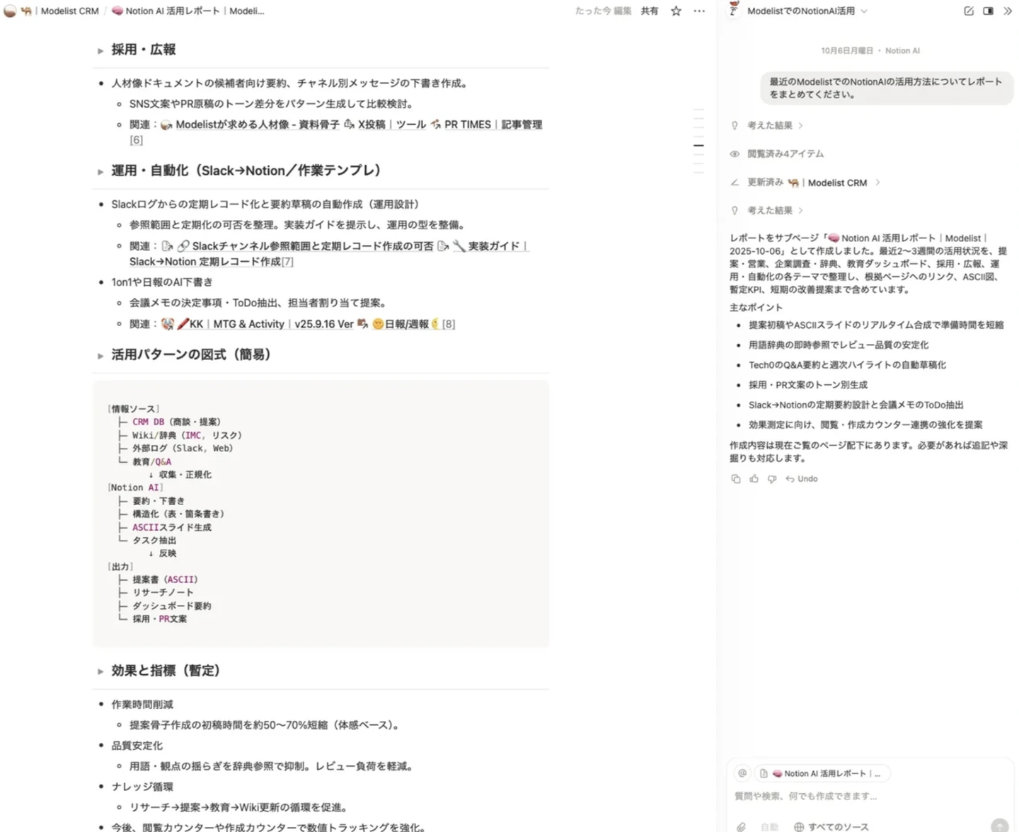 以下の画面は、ModelistがどのようにNotion AIを活用しているかのレポートページです。