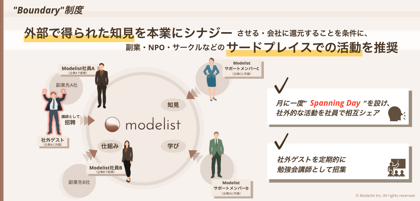 また、Modelistの組織文化そのものが私たちの強みです。多様な経験を持つメンバーが集まり、実際に「バウンダリースパナー」として機能する環境を社内からも実践しています。私たちは自らが提唱する「知識共有」と「オープンなコミュニケーション」を社内でも徹底しています。