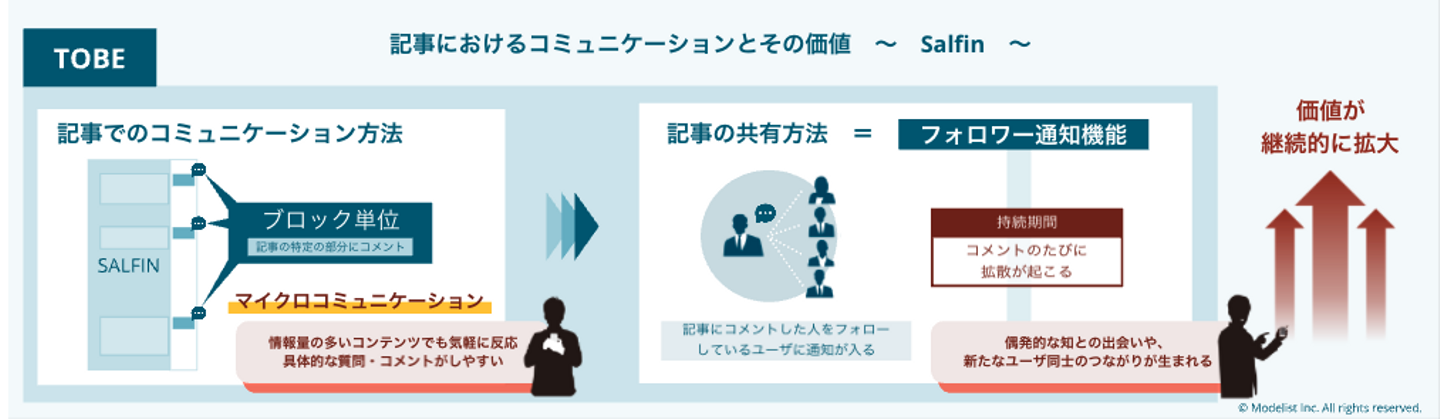 現在のWebメディアやナレッジプラットフォームは「リアクション」という価値にあまり焦点を当てていません。記事を投稿しても、それに対する反応や対話がなければ、そのナレッジは死んでしまいます。Salfinでは、コンテンツへのリアクションやコミュニケーションを促進し、ナレッジの価値を高め続ける仕組みを作っています。