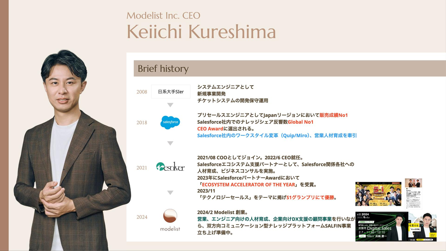 新卒で大手Slerにエンジニアとして入社。Salesforceでの経験を経て、2024年2月に株式会社Modelistを設立。社会におけるデジタルバウンダリースパナー人材の創出をミッションとして、組織における境界線(バウンダリー)をデジタル活用 × イネーブルメントを通して人と組織の成長を最大化することをビジョンを掲げている。