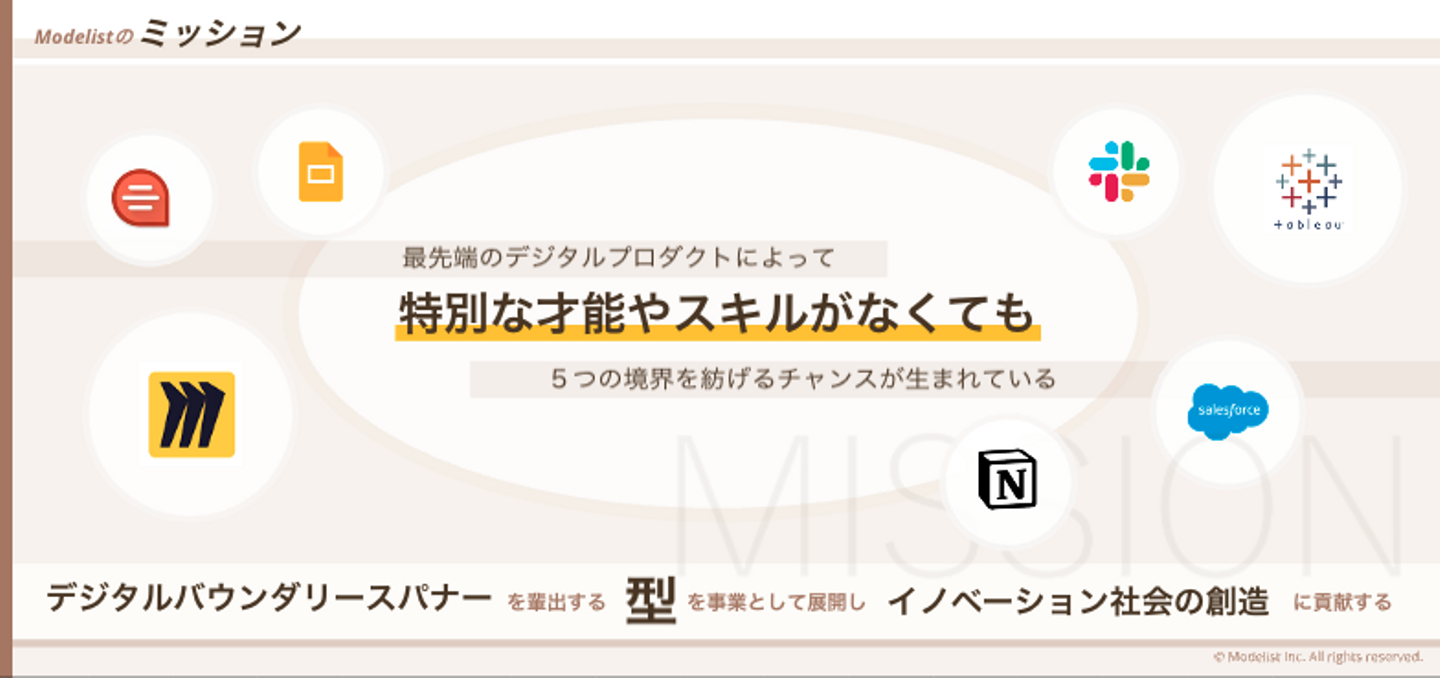 株式会社Modelistは、「企業成長のためのデジタルバウンダリースパナー人材の創出」というミッションを掲げ、ビジネスパーソンのためのナレッジコミュニケーションプラットフォーム「Salfin(サフィン)」を開発・運営しています。