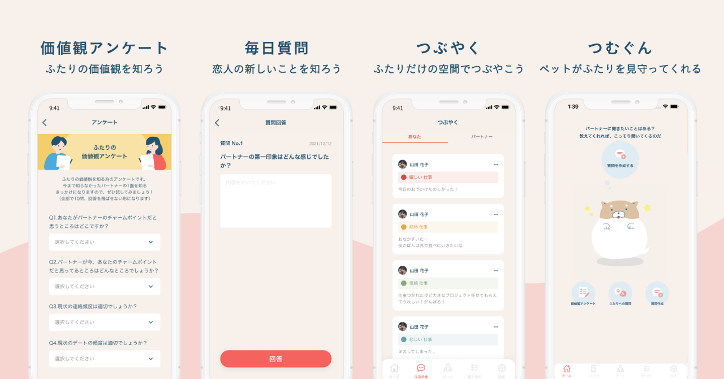 - 【つむぐん】:OurTimeではつむぐんという、あなたとパートナーの物語を見守ってくれるペットがいます。ただ質問に回答するだけの単調なアクションで終わらず、つむぐんの色々な表情を楽しんでもらえます。