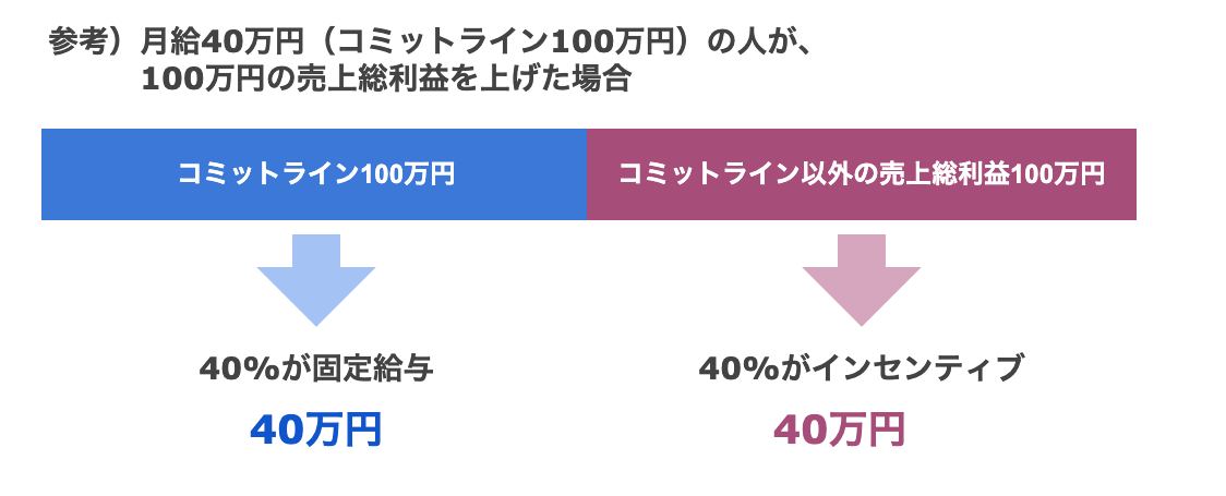 このラインを超えた分の40パーセントは、賞与としてメンバーに還元されます。例えば、売上総利益でコミットライン100万円分に加え、さらに100万円分の売上総利益があった場合、給与と賞与で合計80万円が支給されます。
