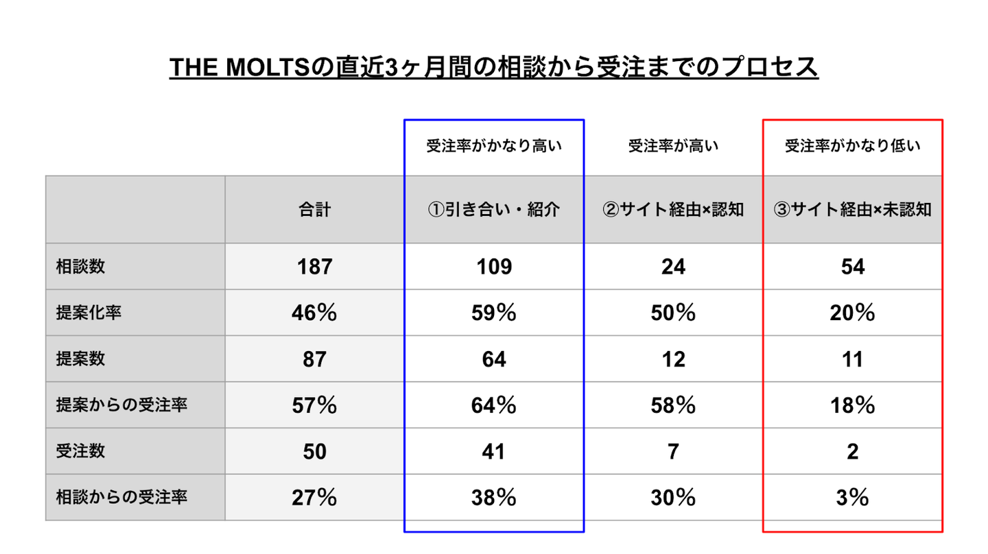 相談時点でTHE MOLTSに期待してくれているかどうかで、受注率にこれだけ大きな差が生まれることが明らかになりました。