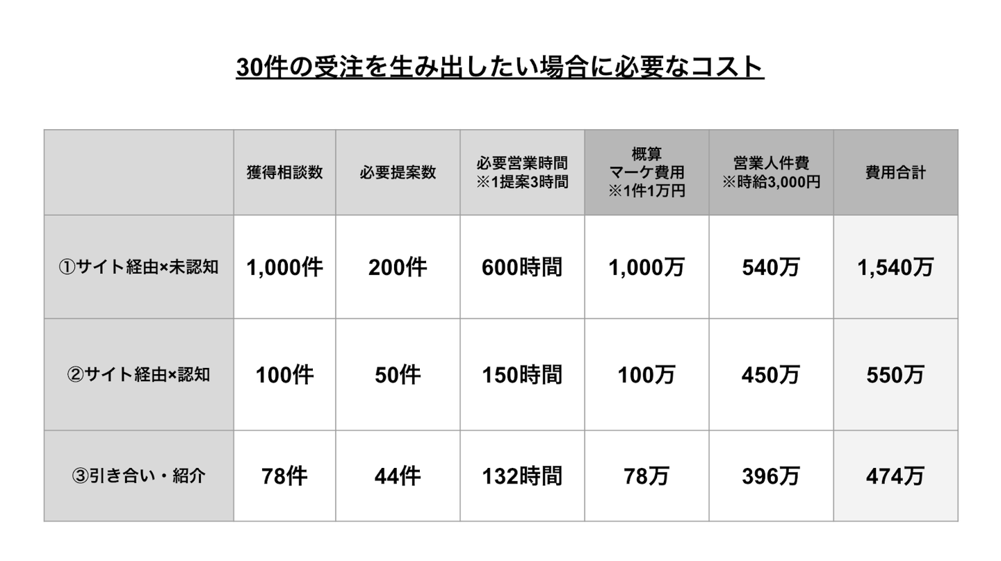 あくまでざっくりですが、問い合わせを獲得するためのマーケティング費用が1件1万円、提案にかかる人件費が1件3時間×時給3,000円=9,000円とすると、「③未認知」は1,540万かかるのに対し「①紹介」は474万円と、1,066万円のコスト差があります。約1,000万円も浮くとなるとP/Lに大きなインパクトがありますし、これだけ営業時間が短縮できるのであれば、そもそも営業の人員を減らすことも検討できるでしょう。