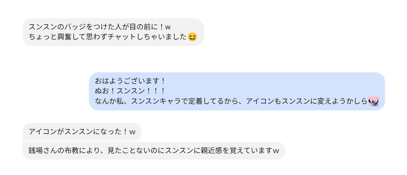 〔こんな感じで雑談から仕事の相談まで気軽にチャットをしています!ちなみにスンスンが好きです。笑〕