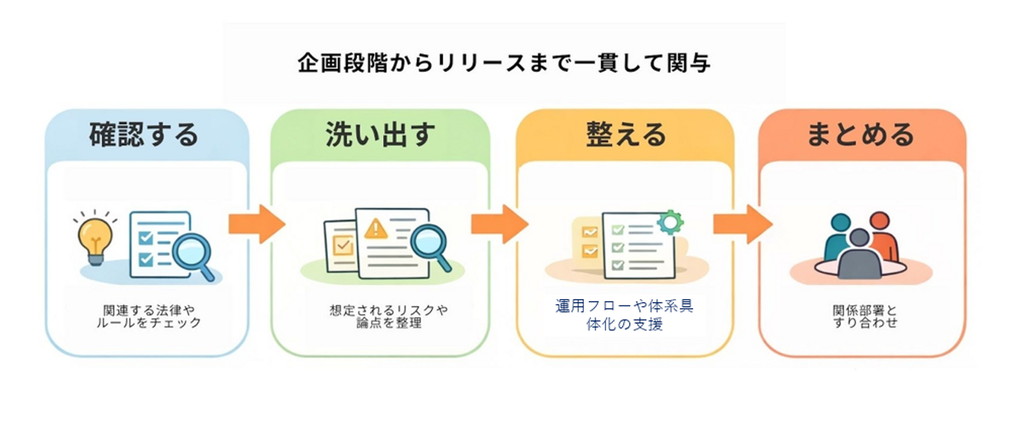 他部署から「このサービスは実現できる?」「法的なリスクは?」といった相談が入ります。企画の初期段階から関わり、リスクや論点を整理します。この段階で論点を整理できるかどうかが、その後の進行を大きく左右します。 - 実現に向けた判断・調整