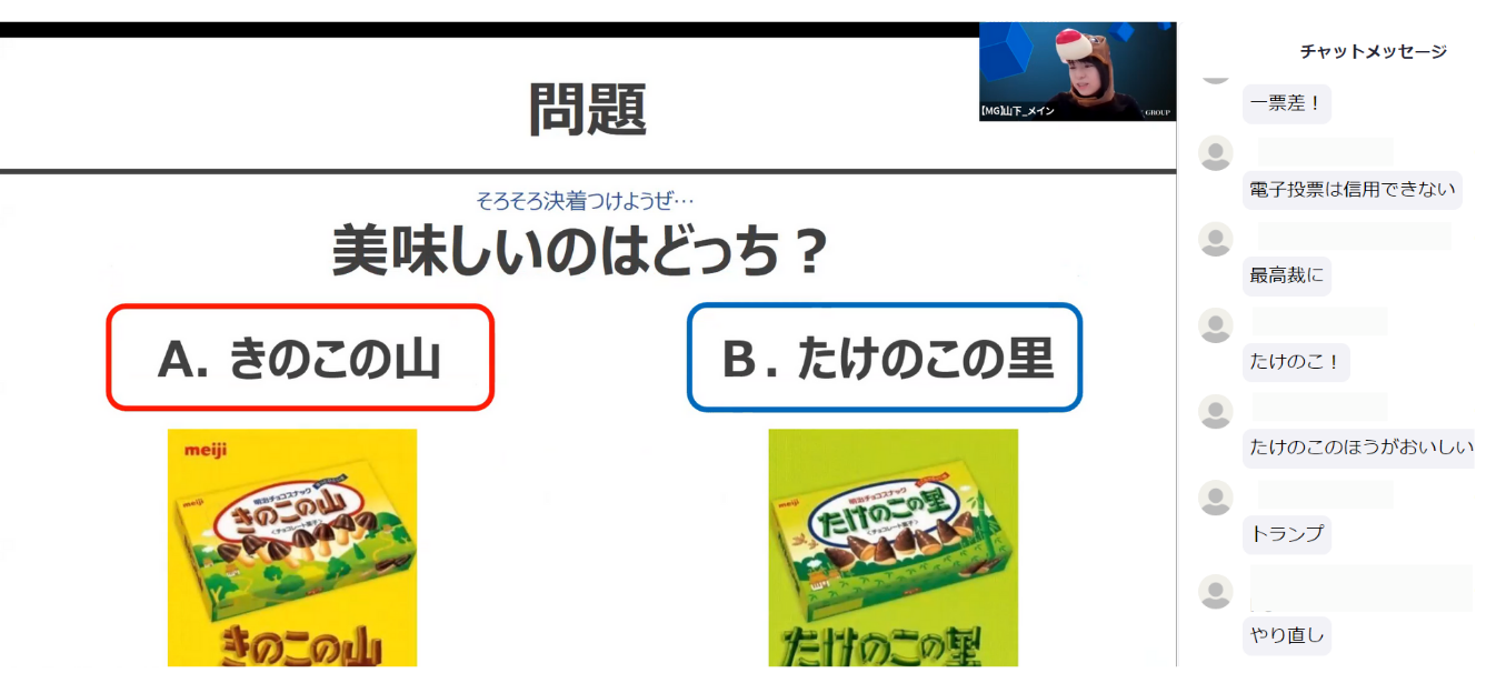 これが大いに盛り上がりまして、特に「きのこたけのこ問題」では1票差できのこの山が勝利、運営の不正を疑われるくらい奇跡的な分かれ方をしました(チャットの治安が悪くなりました)