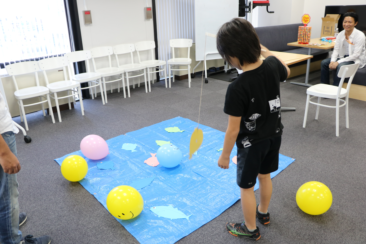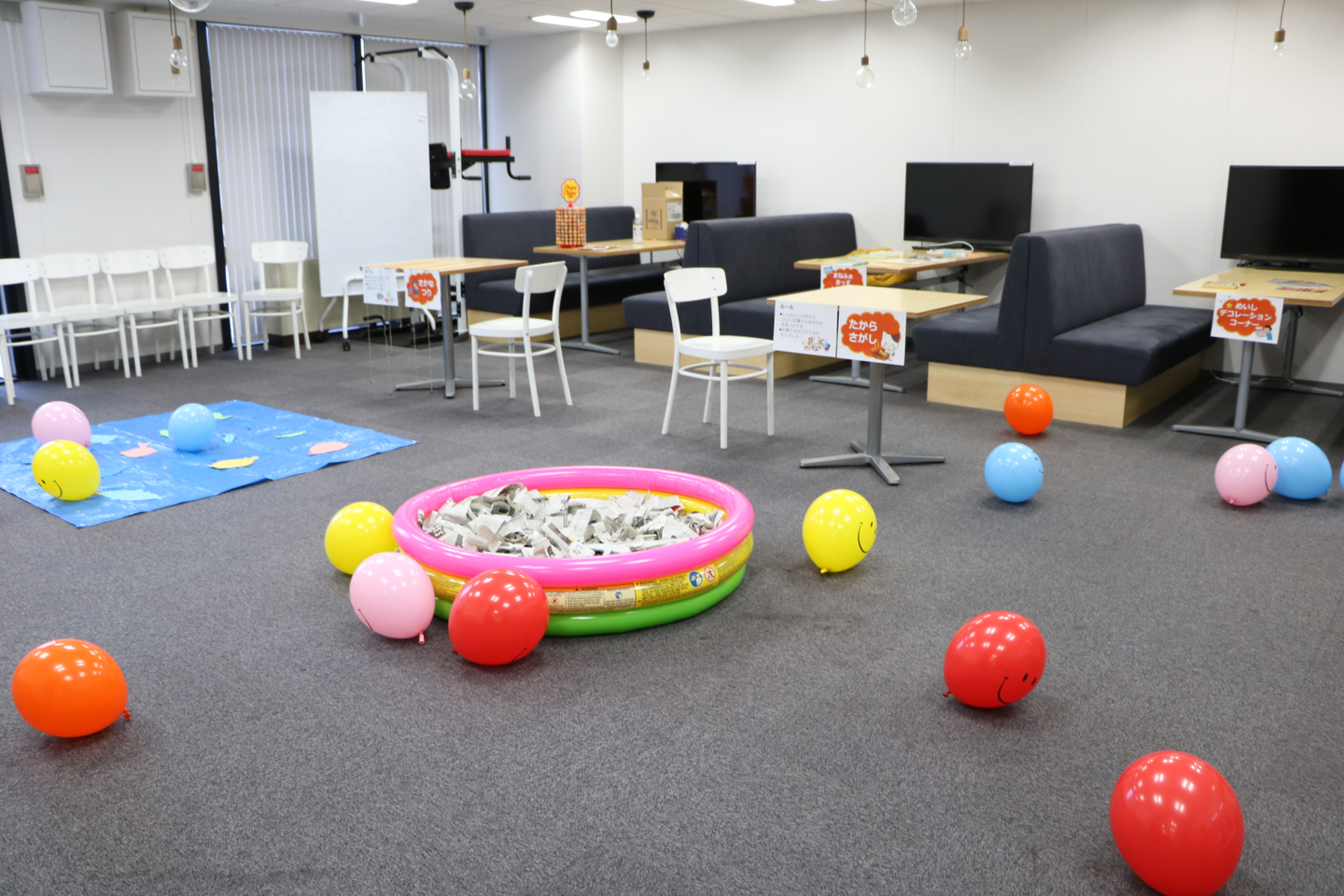 お子さんに大人気なのがこちらのコーナーです。宝探しと魚釣りの2種類のゲームを用意し、風船を散りばめました。