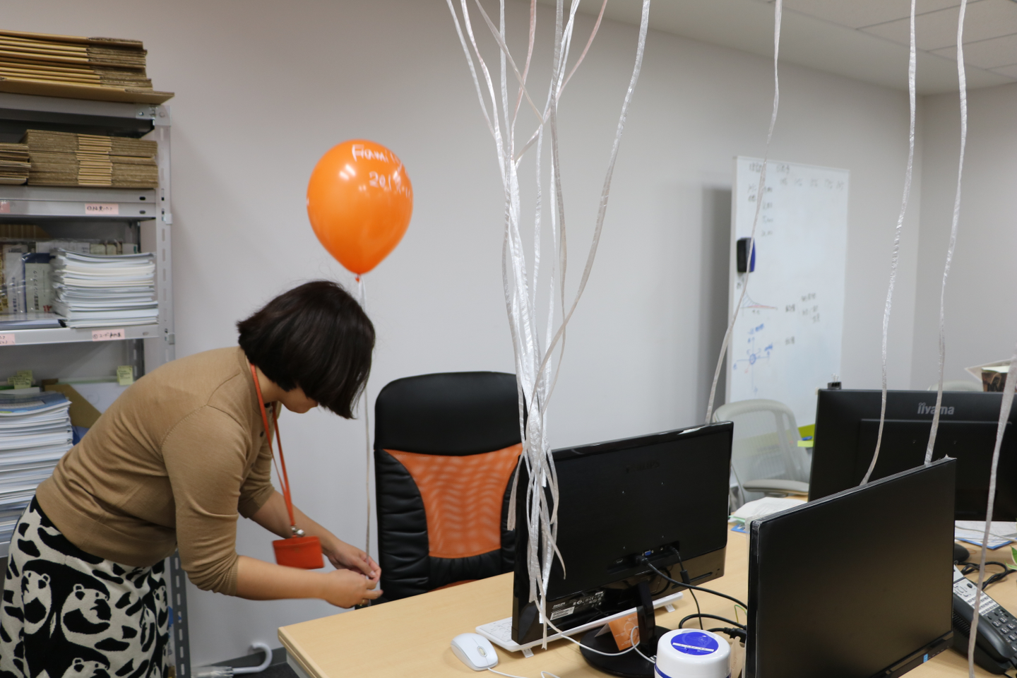 風船の裏には記念になるように日付も手書きしました。ひとつひとつメンバーの椅子に結んでいきます。