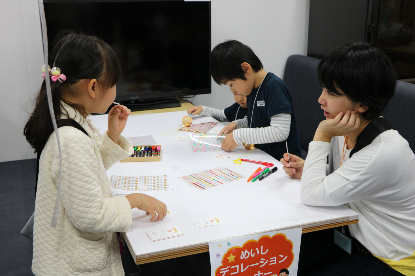 どうぶつシールやキラキラシール、ペンなどを用意したところ、会の間中お子さん達で賑わっていました!