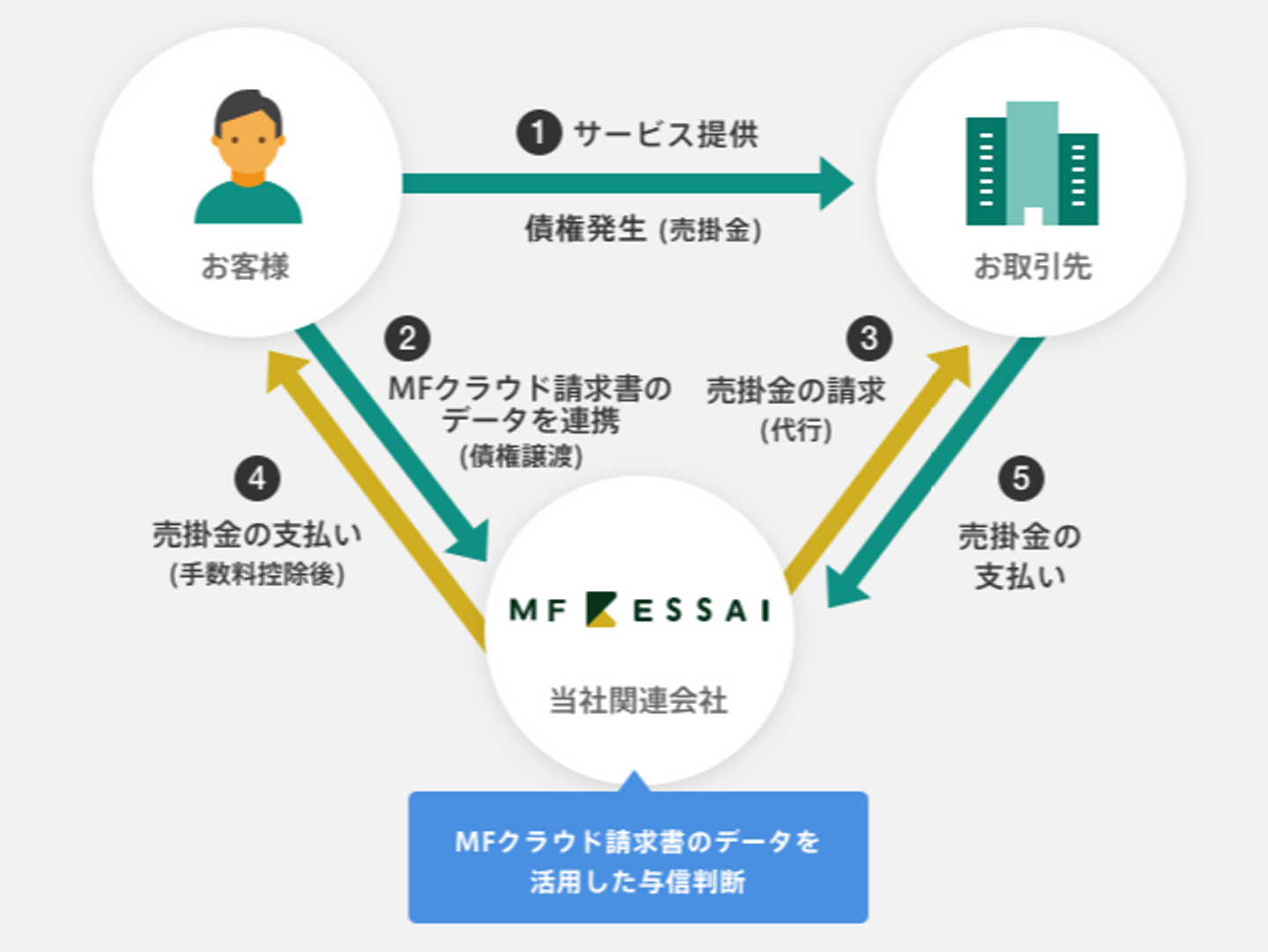 冨山:はい、その通りです。『MF KESSAI』は、企業の与信審査から請求書発行、代金回収までの決済業務を一括して代行する企業間後払い決済サービスなのに対して、「請求書買取りβ」は、売上の早期入金を希望されるMFクラウド請求書のお客様の売掛債権を、『MF KESSAI』がMFクラウド請求書のデータを活用した与信判断を行い買い取ることで、売上の早期入金を行います。