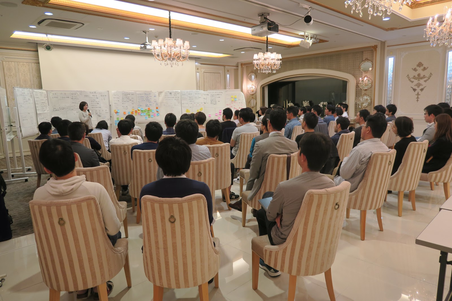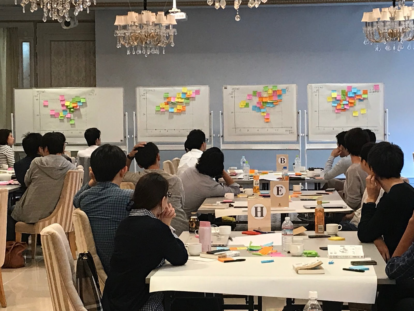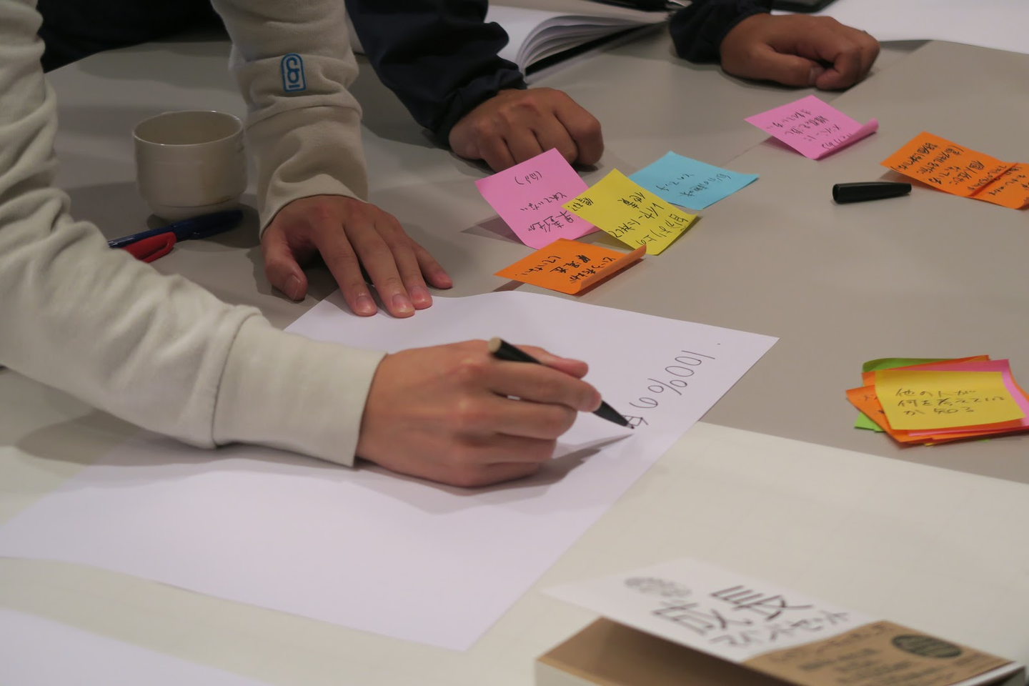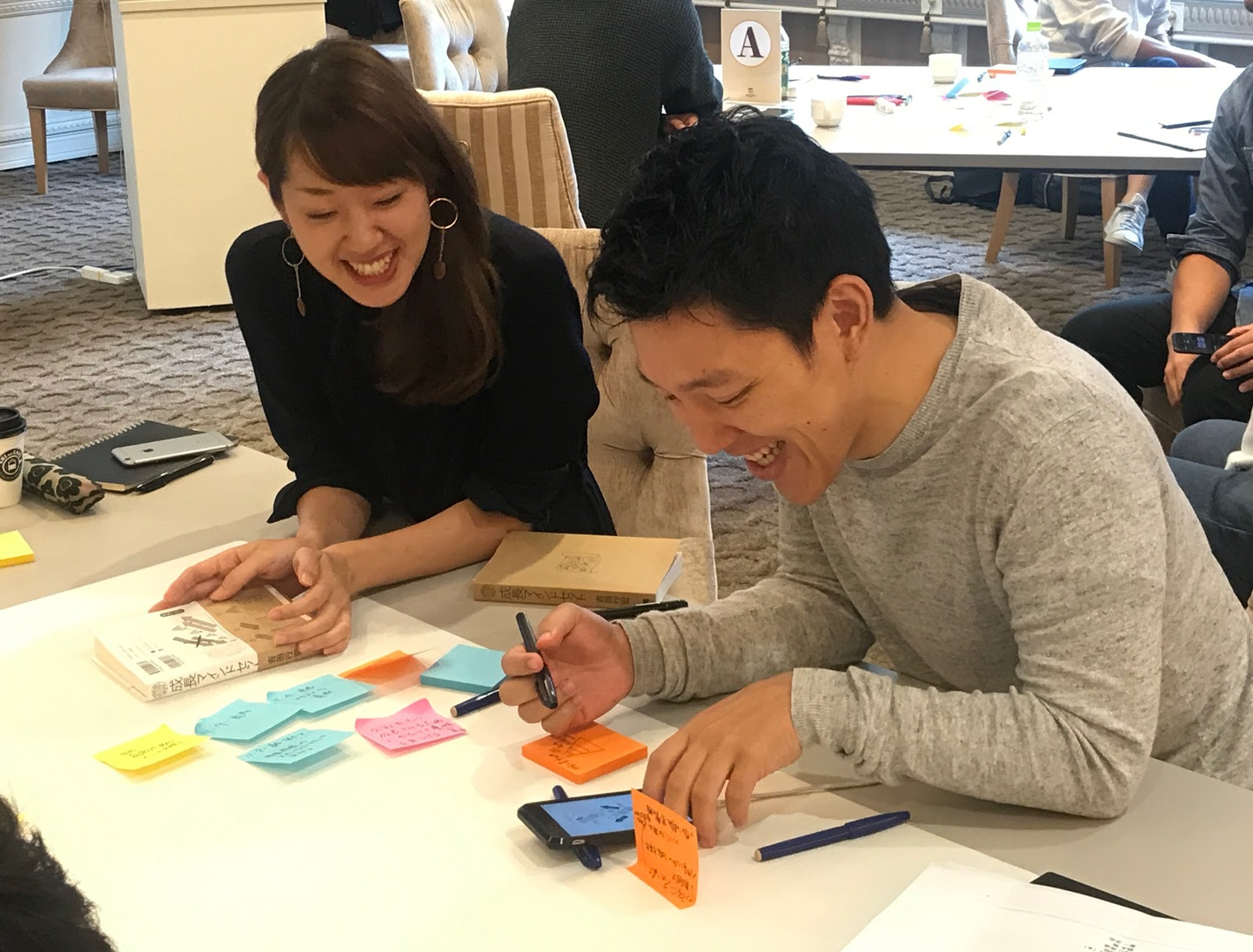 吉田さんの研修は、吉田さんが一方的に私たちにレクチャーするというより、自分たちで考えて気づいたことをシェアし合うというスタイルです。4~5人のチームでワークに取り組み、終わる頃にはどこのテーブルもポストイットが山積みに。