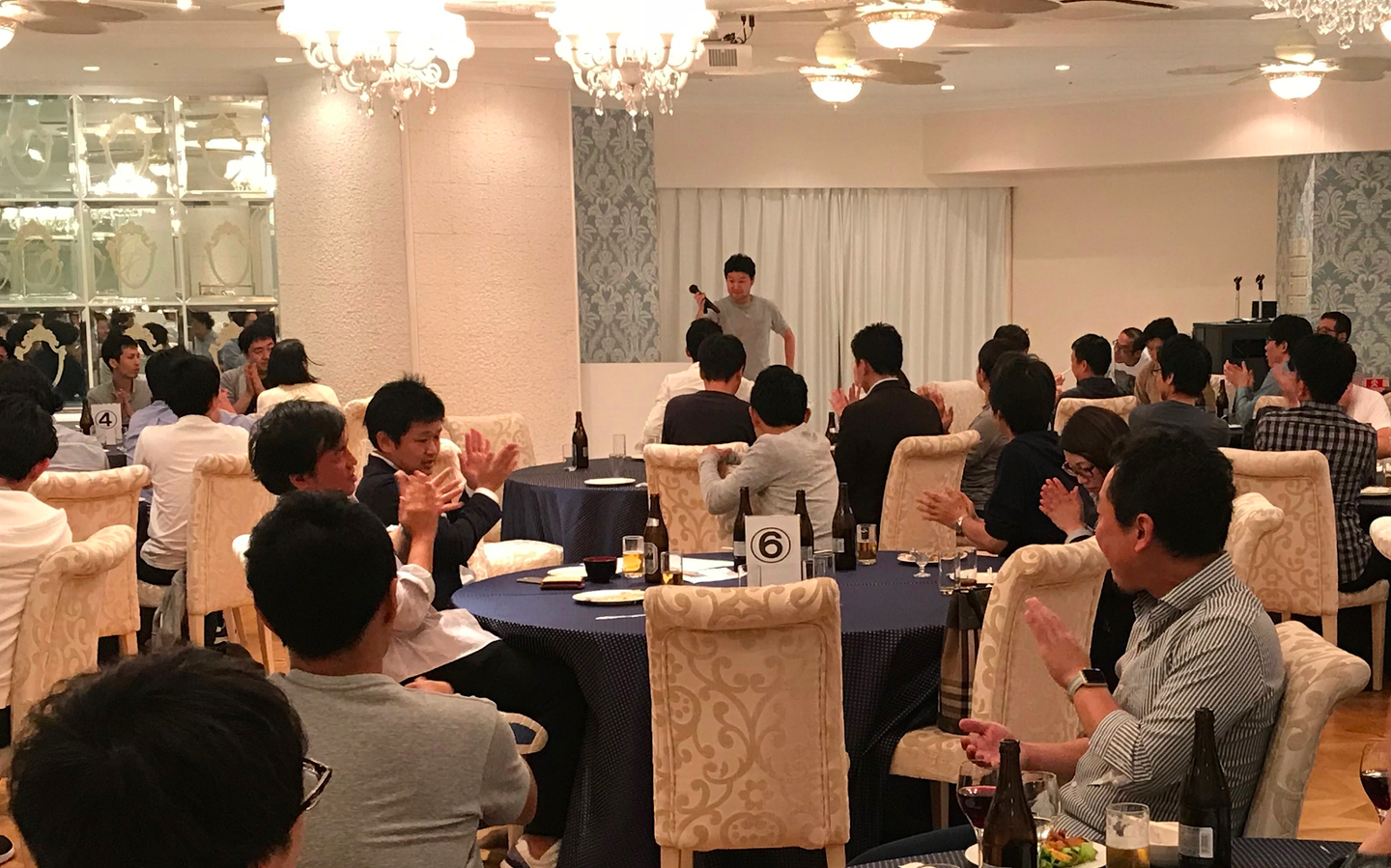 研修後は、大懇親会。「5年後のマネーフォワード」というお題でそれぞれのテーブルでごはんを食べながらディスカッションし、大盛り上がりの夜となりました。「マネーフォワードを使う行為を『マネフォする』という動詞にしたい!」「入社したい会社No.1になる」「合コンでモテる会社になる」「グローバルを超えて銀河系に進出する」など、大きな野望がたくさん出てきました(笑)。ここでは到底書けないようなことがほとんどだったので、割愛します…。