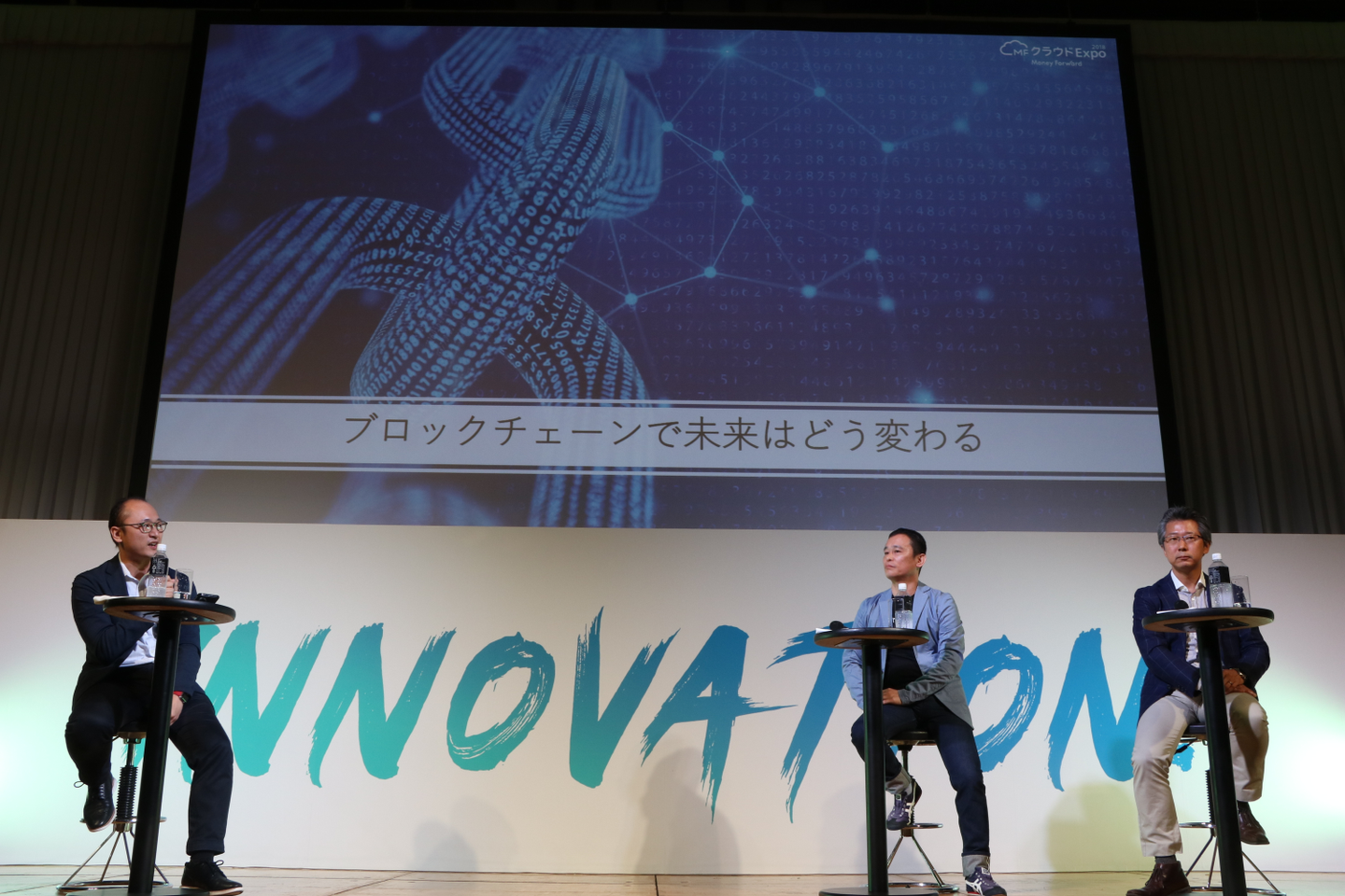 つづいて、オープニングセッションとして、TRENDE株式会社 代表取締役社長 妹尾 賢俊 様をお迎えして、当社取締役 兼 Fintech研究所長の瀧、グループ会社のマネーフォワードフィナンシャル代表取締役の神田とともに『ブロックチェーンを味方にできる企業』をテーマにお話し致しました。ブロックチェーンによって金融業界にとどまらず、電力業界やゲームなどのエンタメなどにイノベーションの機運が高まっているという話に多くの方が関心を示していました。
